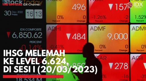 IDX CHANNEL - Indeks Harga Saham Gabungan (IHSG) ditutup terkoreksi pada perdagangan sesi pertama hari ini, Senin (20/3/2023). Indeks tercatat turun 0,81% atau 54,13 poin ke level 6.624. Pagi ini, indeks dibuka pada level 6.678 yang sekaligus menjadi level tertinggi hingga perdagangan sesi pertama hari ini.