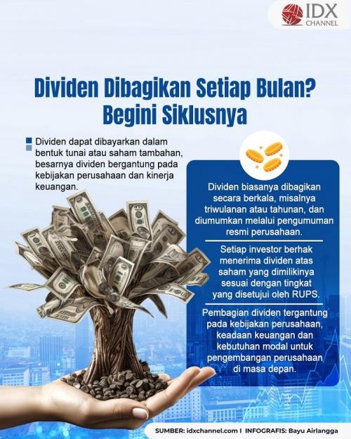 IDXChannel - Dividen adalah pembagian sebagian atau seluruh pendapatan atau keuntungan suatu perusahaan kepada pemegang saham. Dividen dapat dibayarkan dalam bentuk tunai atau saham tambahan, dan besarnya dividen yang dibayarkan perusahaan bergantung pada kebijakan perusahaan dan kinerja keuangan.