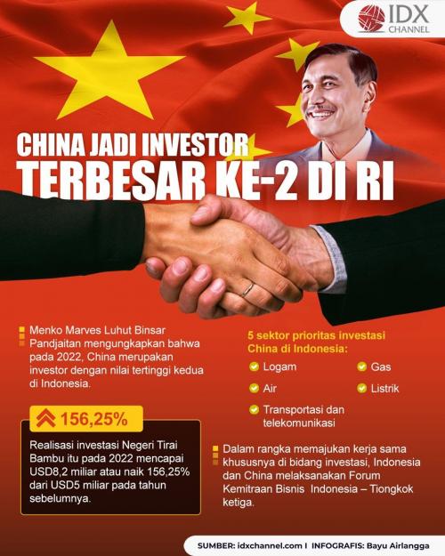 Adapun realisasi investasi Negeri Tirai Bambu itu pada 2022 mencapai USD8,2 miliar atau naik 156,25% dari USD5 miliar pada tahun sebelumnya.