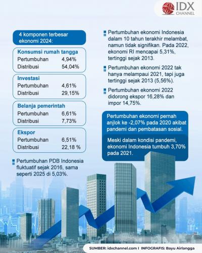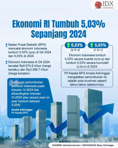 IDXChannel – Badan Pusat Statistik (BPS) mencatat ekonomi Indonesia pada kuartal IV-2024 berdasarkan produk domestik bruto (PDB) tumbuh 5,02 persen (yoy). Sementara untuk PDB sepanjang tahun lalu tercatat tumbuh 5,03 persen.