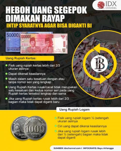 IDXChannel - Heboh Uang Segepok Dimakan Rayap, Intip Syaratnya agar Bisa Diganti BI. Uang yang rusak dimakan rayap ternyata bisa diganti oleh Bank Indonesia (BI). Namun, ada syarat yang harus dipenuhi terlebih dahulu.
