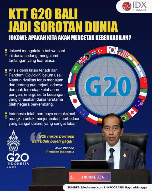 IDXChannel - Hari ini Presiden Jokowi resmi membuka KTT G20 di Bali, yang mana penyelenggaraan ini tertuju oleh semua mata dunia karena peserta presidensi pun ialah Menlu dari berbagai Negara, dan beliau berharap G20 harus berhasil dan tidak boleh gagal walaupun dunia sedang mengalami tantangan.