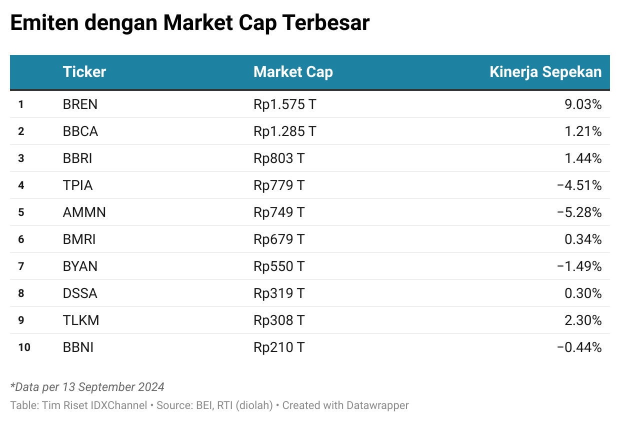 Di posisi kedua, ada emiten bank Grup Djarum PT Bank Central Asia Tbk (BBCA) yang memiliki market cap Rp1.285 triliun. Posisi BBCA digeser oleh BREN yang memiliki kinerja jauh lebih kencang di tengah spekulasi pelaku pasar.