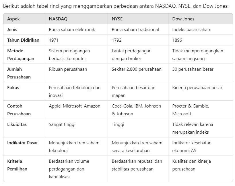 Ketiga entitas NASDAQ, NYSE, dan Dow Jones memiliki peran penting dalam pasar saham. NASDAQ unggul dalam hal inovasi dan teknologi, NYSE menawarkan reputasi dan stabilitas, sementara Dow Jones berfungsi sebagai indikator kesehatan pasar. Memahami perbedaan dan keunggulan masing-masing dapat membantu investor membuat keputusan yang lebih informasi dalam berinvestasi.