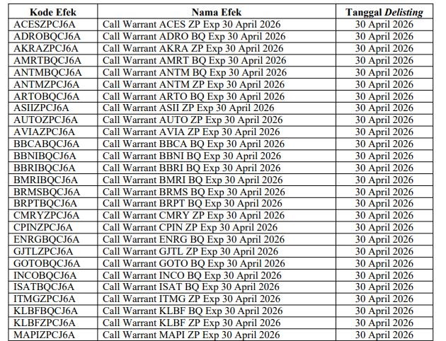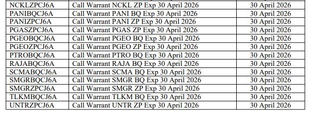 Berikut daftar 40 waran terstruktur yang akan hangus pada 30 April 2026:
