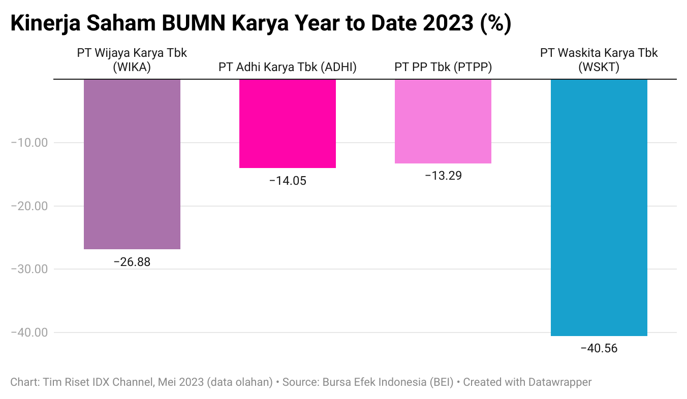 Di samping itu, Bursa Efek Indonesia (BEI) pada sesi II, Selasa (2/5) mencatat, saham emiten ini juga ambruk hingga 40,56 persen, disusul oleh saham emiten BUMN karya lainnya yang memerah pada periode ini. (Lihat grafik di bawah ini.)