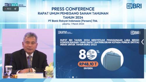 “Atas pencapaian kinerja, dalam RUPST telah menyetujui penggunaan laba pengkonsolidasian yang diatribusikan pemilik 80% sebagai dividen atau sekurang Rp48,1 triliun atau sebesar Rp319 per lembar saham,” ujar Sunarso dalam Press Conference RUPST BRI 2024, Jumat (1/3/2024).