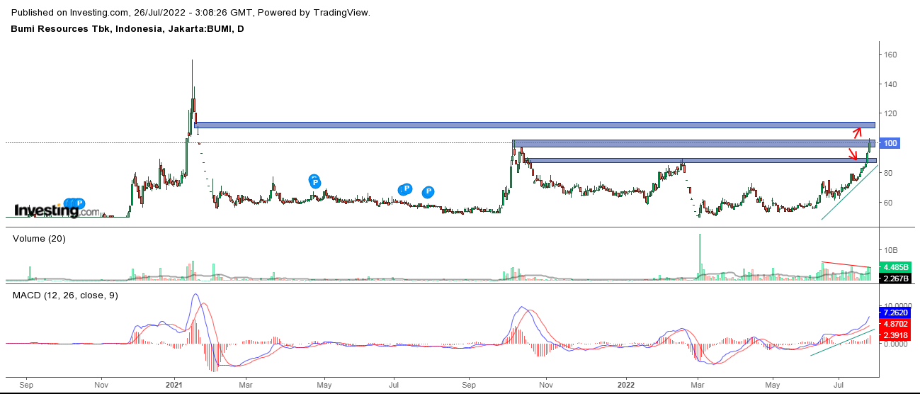 Dengan ini, saham BUMI menembus level resistance kuat Rp102/saham.