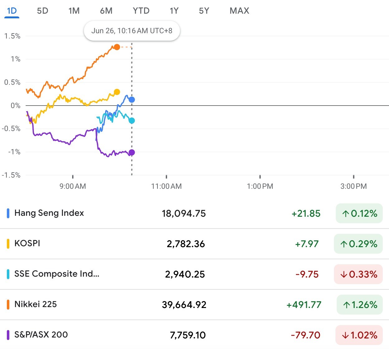 IDXChannel - Bursa Asia beragam pada pembukaan perdagangan Rabu (26/6/2024). Indeks saham di Hong Kong dan Korea Selatan hingga Jepang menguat, sedangkan saham China dan Australia melemah.