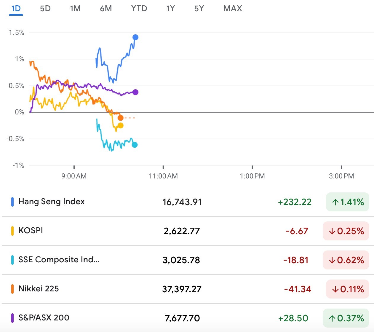 Lebih lanjut, indeks Nikkei 225 Jepang turun 0,11 persen di level 37.397, setelah tidak mampu mempertahankan level tertinggi baru (new all-time high/ATH) di 41.000. (Lihat grafik di bawah ini.)