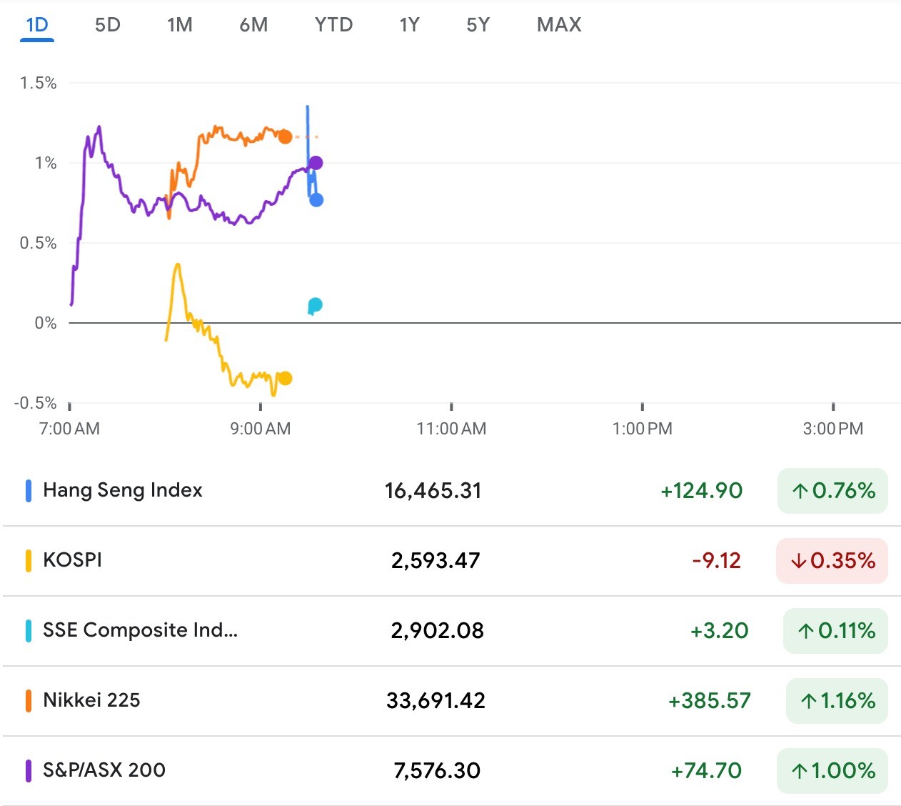 Indeks Shanghai Composite China, Hang Seng Hong Kong, ASX 200 Australia hingga Nikkei 225 Jepang kompak menguat. Sementara indeks KOSPI Korea Selatan melemah.