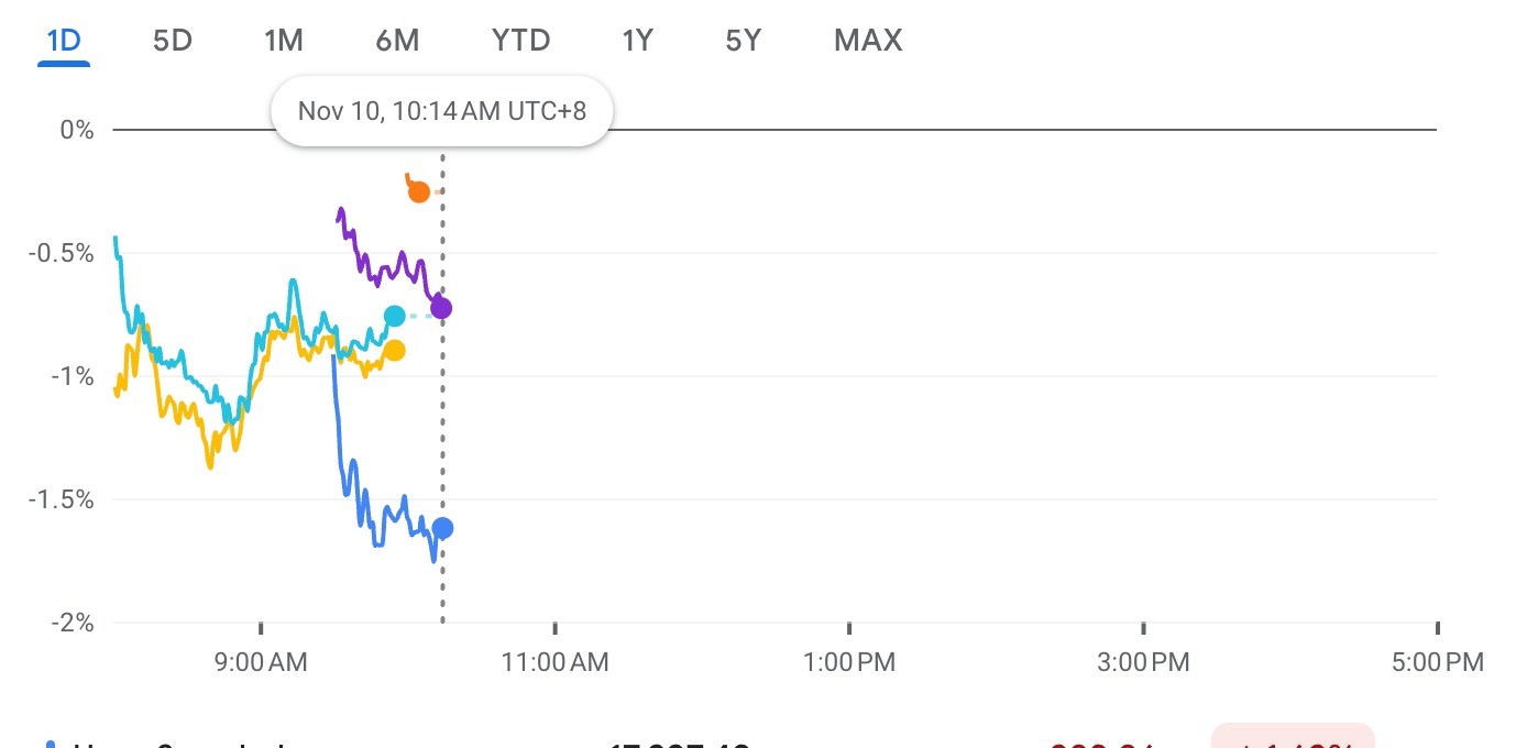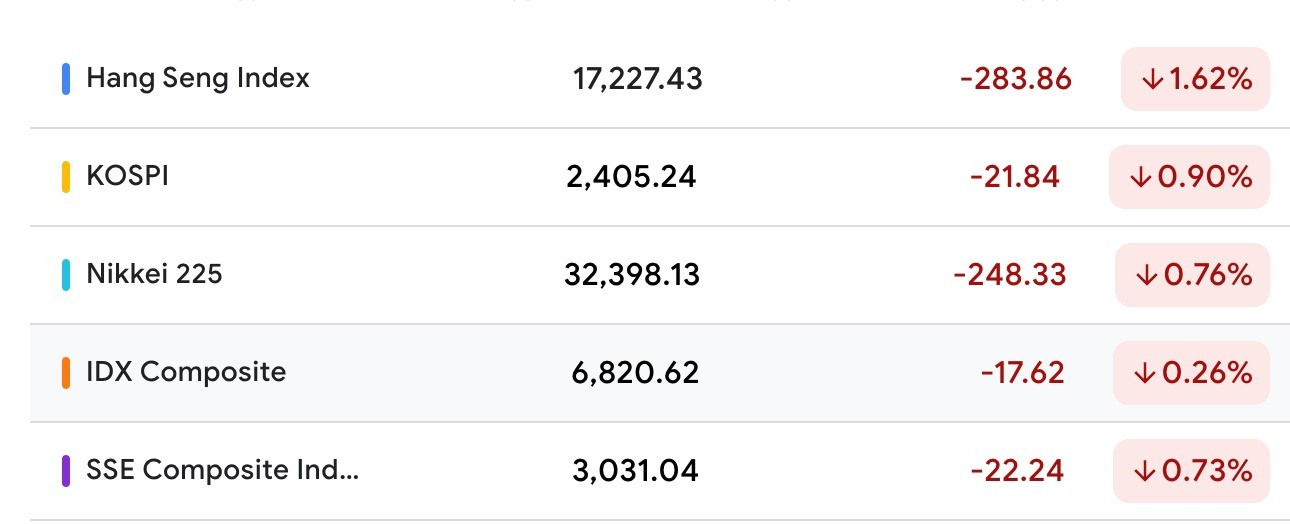 Di pasar China, Indeks Shanghai Composite turun 0,73 persen. Indeks Hang Seng Hong Kong turun paling dalam sebanyak 1,62 persen. Indeks ASX 200 di bursa Australia melemah 0,49 persen. Sementara Indeks Harga Saham Gabungan (IHSG) juga dibuka turun 0,26 persen pada waktu yang sama. (Lihat grafik di bawah ini.)