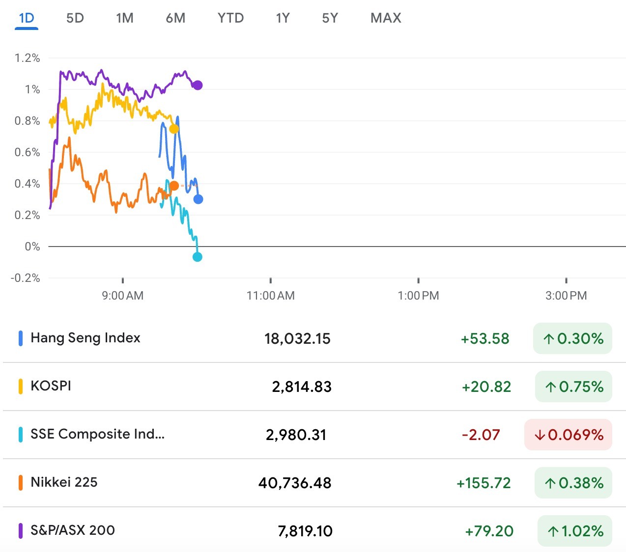 Pada pukul 09.02 WIB, indeks saham Nikkei 225 Jepang naik 0,38 persen di level 40.736,48. Indeks Shanghai Composite turun tipis 0,069 persen di level 2.980,3.