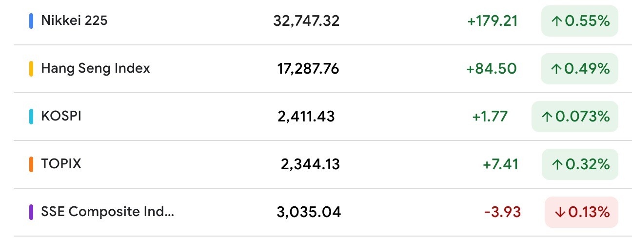 Di Jepang, indeks Nikkei 225 mengalami kenaikan 0,55 persen, sementara indeks TOPIX naik 0,32 persen pada pukul 09.39 WIB. Sementara Indeks Harga Saham Gabungan (IHSG) juga dibuka menguat 0,28 persen pada 09.00 WIB.