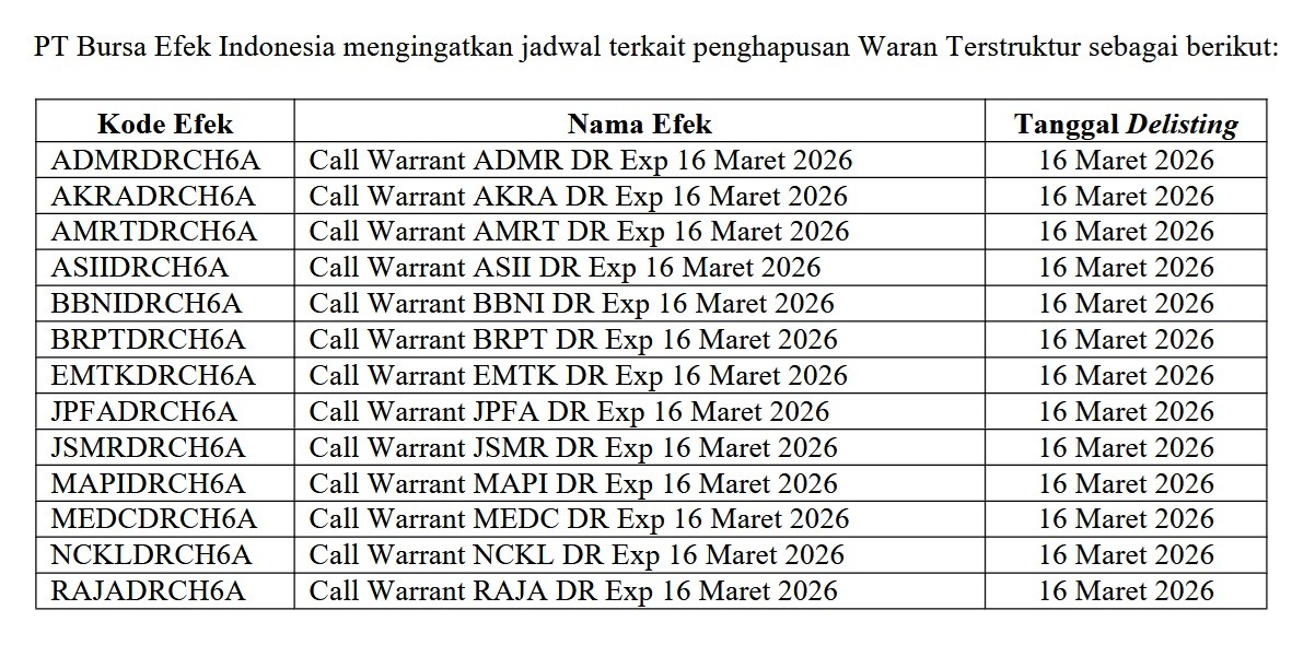 Berikut daftar 13 waran terstruktur yang akan hangus pada 16 Maret 2026: