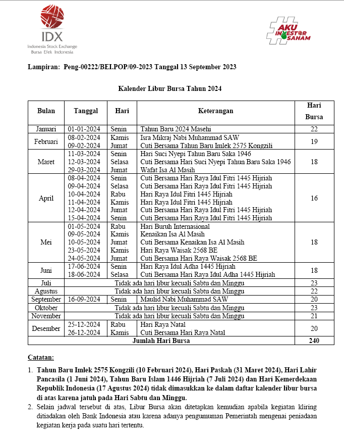 Dengan begitu, berikut adalah jadwal libur Bursa di tahun 2024 mendatang: