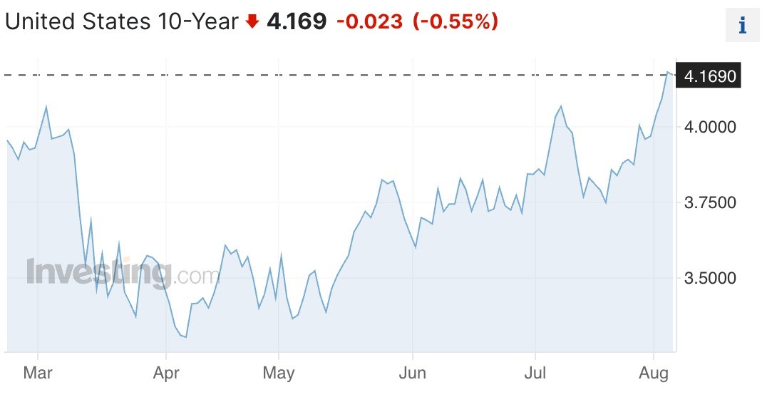 Imbal hasil Treasury AS masih mengalami penurunan pada Jumat (4/8) dengan Treasury 10-tahun turun 0,55 persen di level 4,169 persen. (Lihat grafik di bawah ini.)