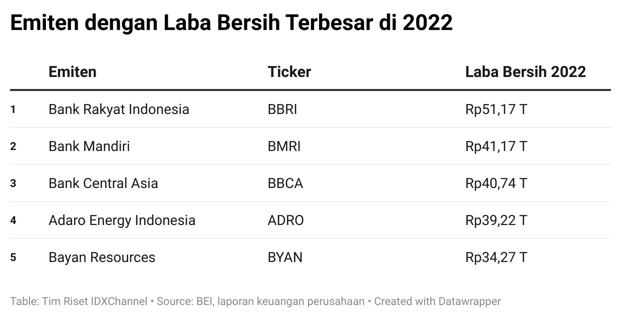 Di bawah tiga bank besar tersebut, ada dua emiten batu bara raksasa, PT Adaro Energy Indonesia Tbk (ADRO) dan PT Bayan Resources Tbk (BYAN) yang masing-masing memiliki laba bersih Rp39,22 triliun dan Rp34,27 triliun. (Lihat tabel di bawah ini.)