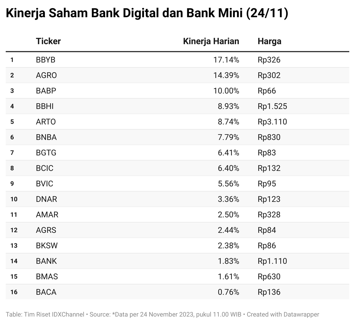 Saham PT Bank Raya Indonesia Tbk (AGRO), emiten milik Hary Tanoesoedibjo PT Bank MNC Internasional Tbk (BABP), serta saham emiten bank milik Chairul Tanjung (CT) PT Allo Bank Indonesia Tbk (BBHI) juga melompat masing-masing 14,39 persen, 10,00 persen, dan 8,93 persen secara harian.