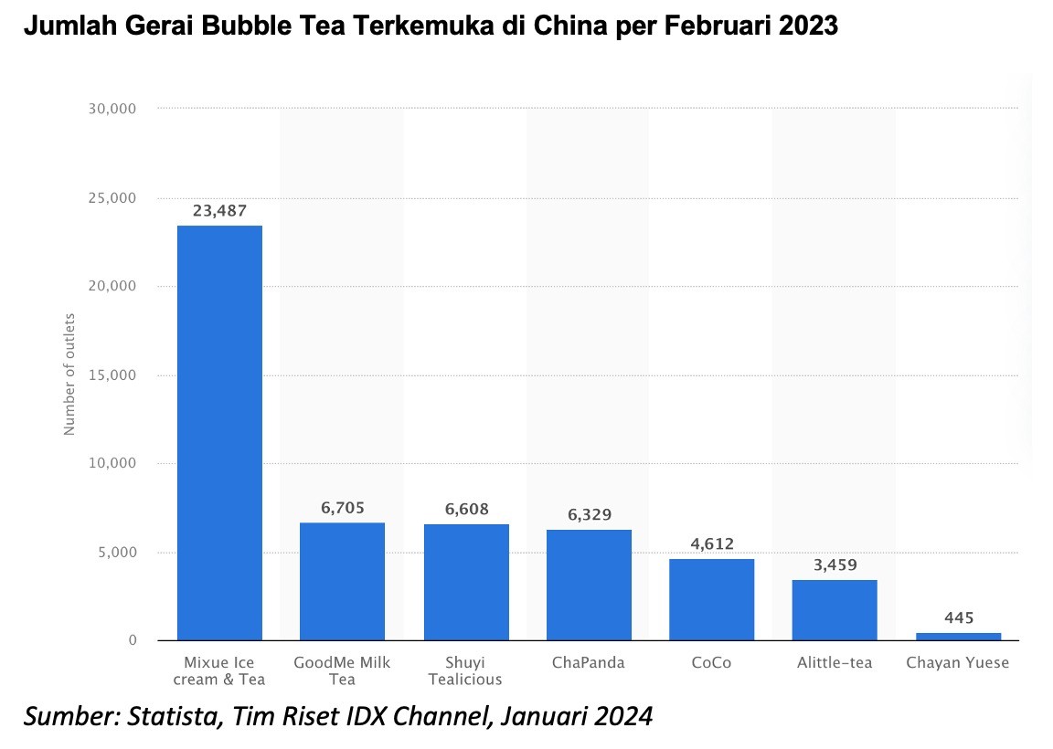 Menurut studi China Chain Store & Franchise Association, sebanyak 486.000 toko bubble tea di negara tersebut memperkirakan peningkatan penjualan tahunan sebesar 40 persen pada tahun 2023, dengan pangsa pasar mencapai sekitar 145 miliar yuan.