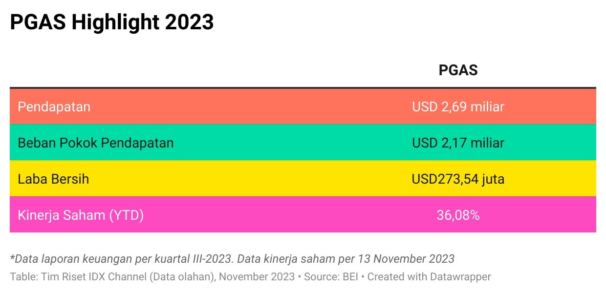 Berdasarkan laporan keuangan kuartal III-2023, PGAS mencatatkan pendapatan mencapai USD2,69 miliar. Namun, perseroan masih harus menanggung beban pokok pendapatan mencapai USD2,17 miliar. Sehingga perseroan mencatatkan laba periode berjalan mencapai USD273,54 juta, turun dibanding periode yang sama tahun sebelumnya yang mencapai USD 366,35 juta. (Lihat grafik di bawah ini.)