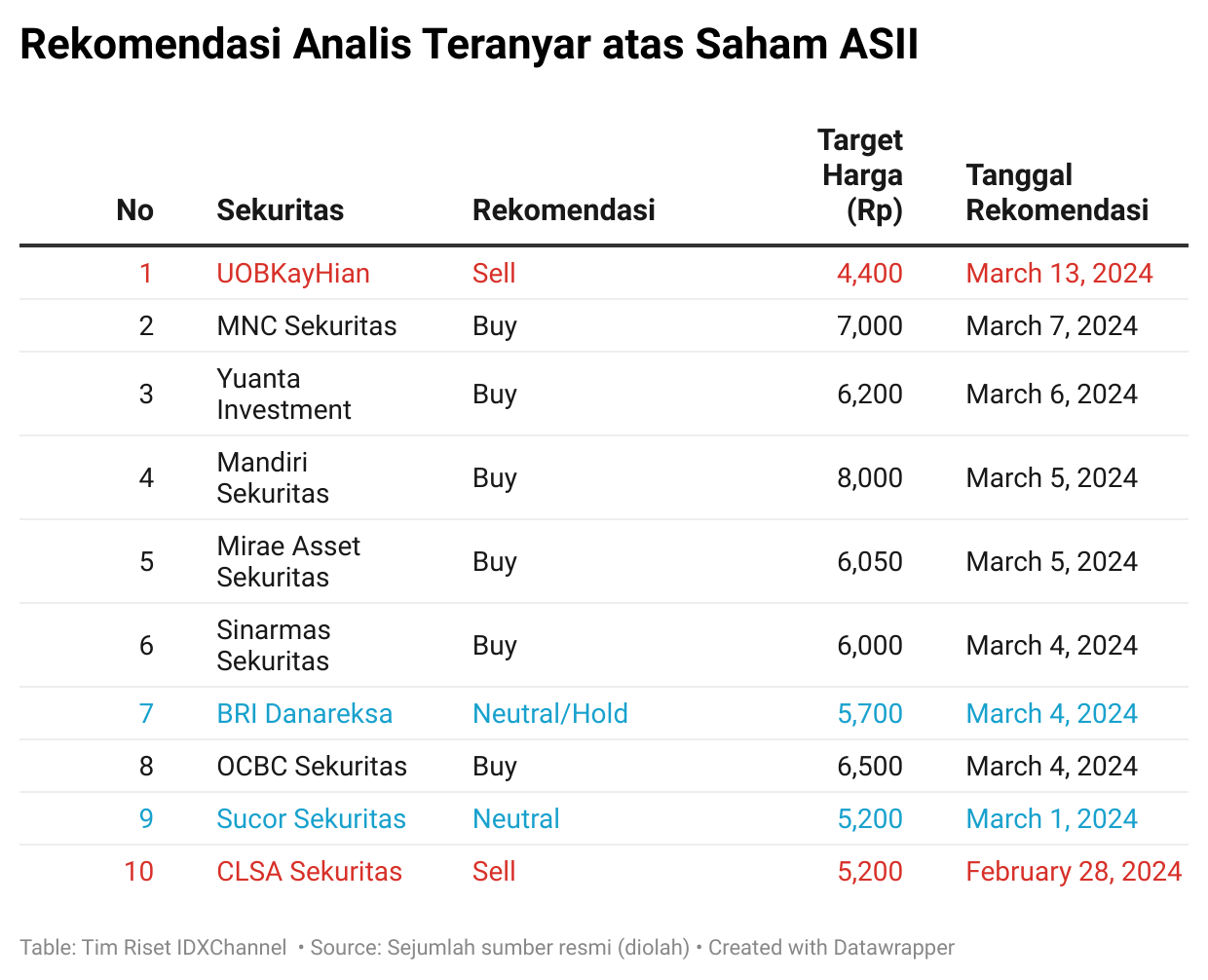 Tindakan menurunkan rating saham ASII dari UOB ini tak pelak lagi cenderung berlawanan arah dengan mayoritas riset analis terbaru yang masih memberikan rekomendasi beli (buy) untuk saham tersebut. (Lihat tabel di bawah ini.)