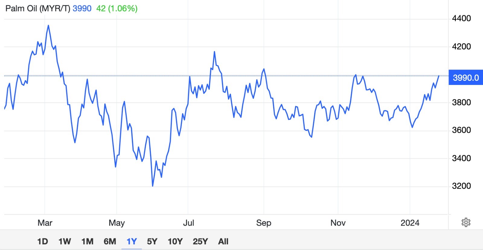 Kenaikan harga CPO mempertahankan momentum kenaikan untuk dua hari berturut-turut di tengah kekhawatiran bahwa cuaca buruk dapat mengganggu produksi di negara-negara produsen utama. (Lihat grafik di bawah ini.)