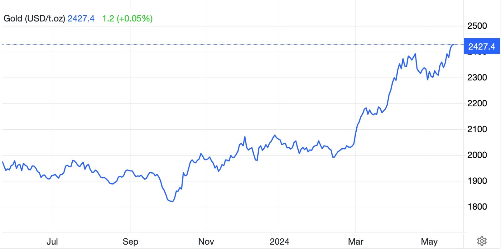 Pada perdagangan Senin (20/5), harga emas di pasar spot ditutup naik 0,21 persen dan sempat melesat mencapai new all-time high (ATH) di level USD2.454 per troy ons dalam perdagangan intraday sesi tersebut.