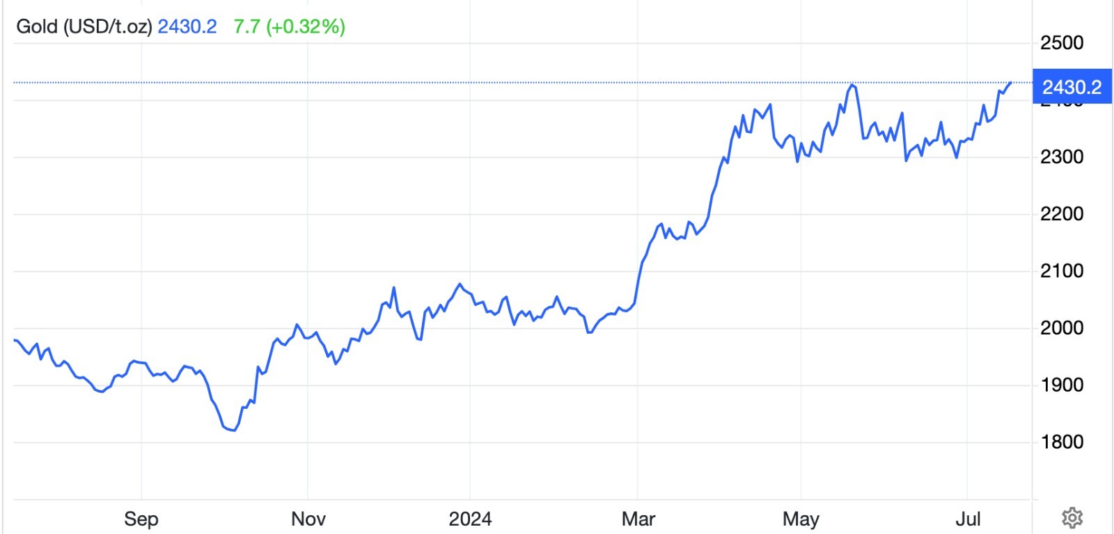 Harga emas sempat mencapai level tertinggi sejak menyentuh rekor penutupan tertinggi USD2.426 per troy ons pada akhir Mei lalu. (Lihat grafik di bawah ini.)