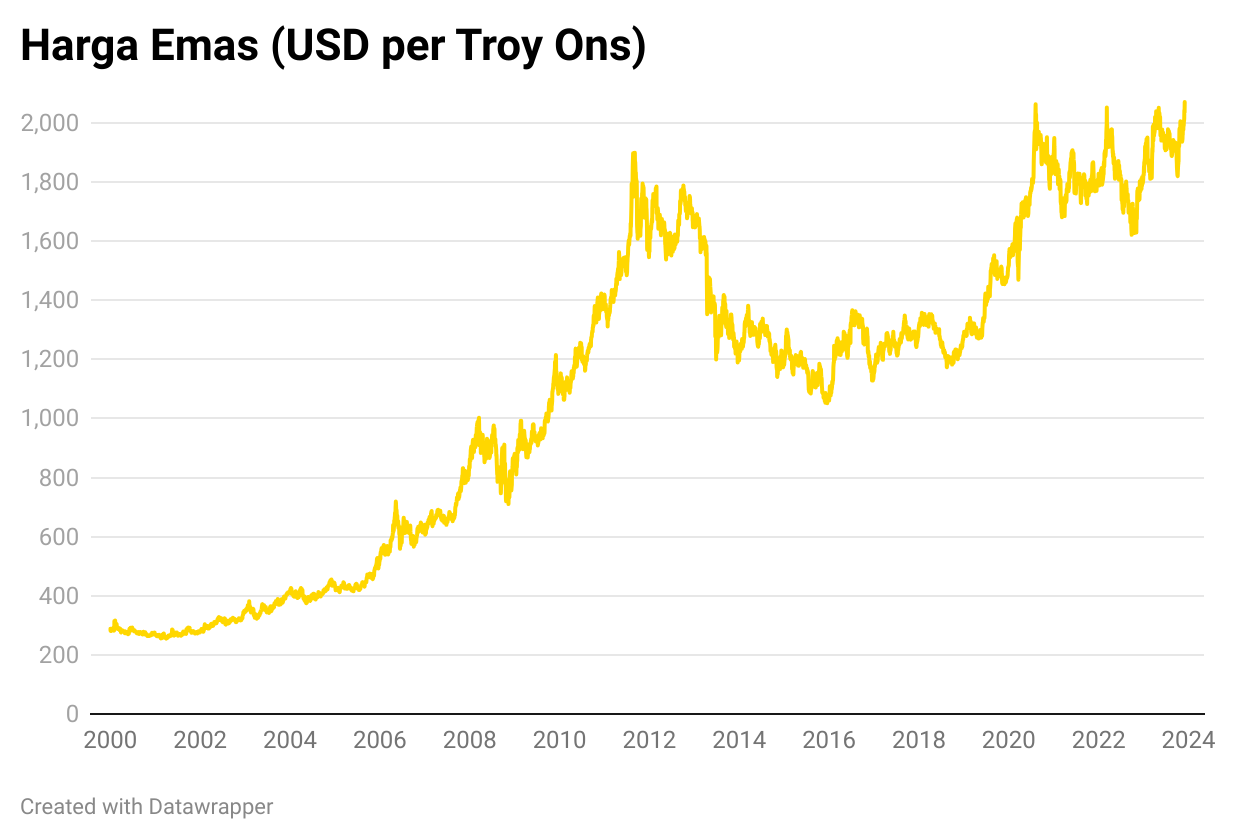 Sebelumnya, harga emas sempat melompat menjadi USD2.075,09 per troy ons, mengalahkan harga tertinggi sepanjang masa sebelumnya di USD2.072,49 yang dicapai pada 2020.