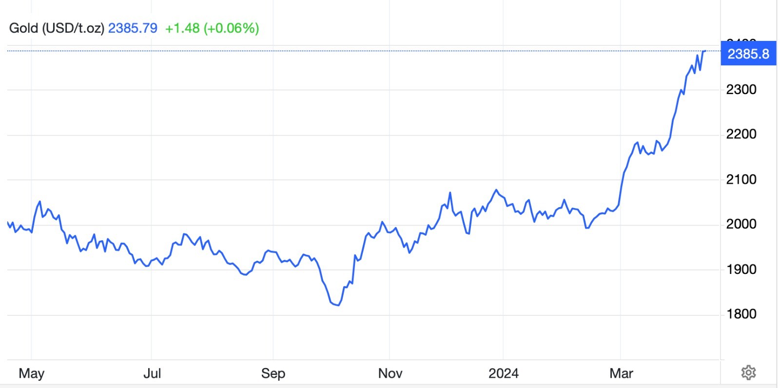 Pada penutupan perdagangan Senin (15/4/2024), harga emas naik ditutup melesat 1,76 persen di level USD2.385 per troy ons. Secara year on year (YOY) harga emas sudah melesat 19,44 persen.