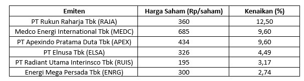 Selain itu, Medco Energi International Tbk (MEDC) dan PT Apexindo Pratama Duta Tbk (APEX) juga mengalami kenaikan harga saham secara signifikan pada pagi ini yakni masing-masing sebesar 9,60 persen. Sementara harga saham MEDC dan APEX menjadi Rp685/saham dan Rp434/saham.