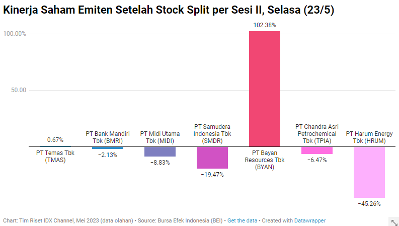 Tercatat, pada 2022, terdapat sejumlah emiten yang melakukan stock split, termasuk PT Bayan Resources Tbk (BYAN), PT Chandra Asri Petrochemical Tbk (TPIA), hingga PT Harum Energy Tbk (HRUM).