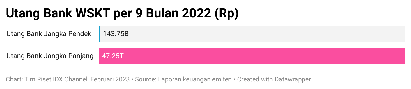 Sementara, total utang bank jangka pendek WSKT kepada pihak ketiga pada 9 bulan 2022 mencapai Rp143,75 miliar. Bahkan, utang bank jangka panjang emiten BUMN Karya tersebut pada periode ini mencapai Rp47,25 triliun. (Lihat grafik di bawah ini.)