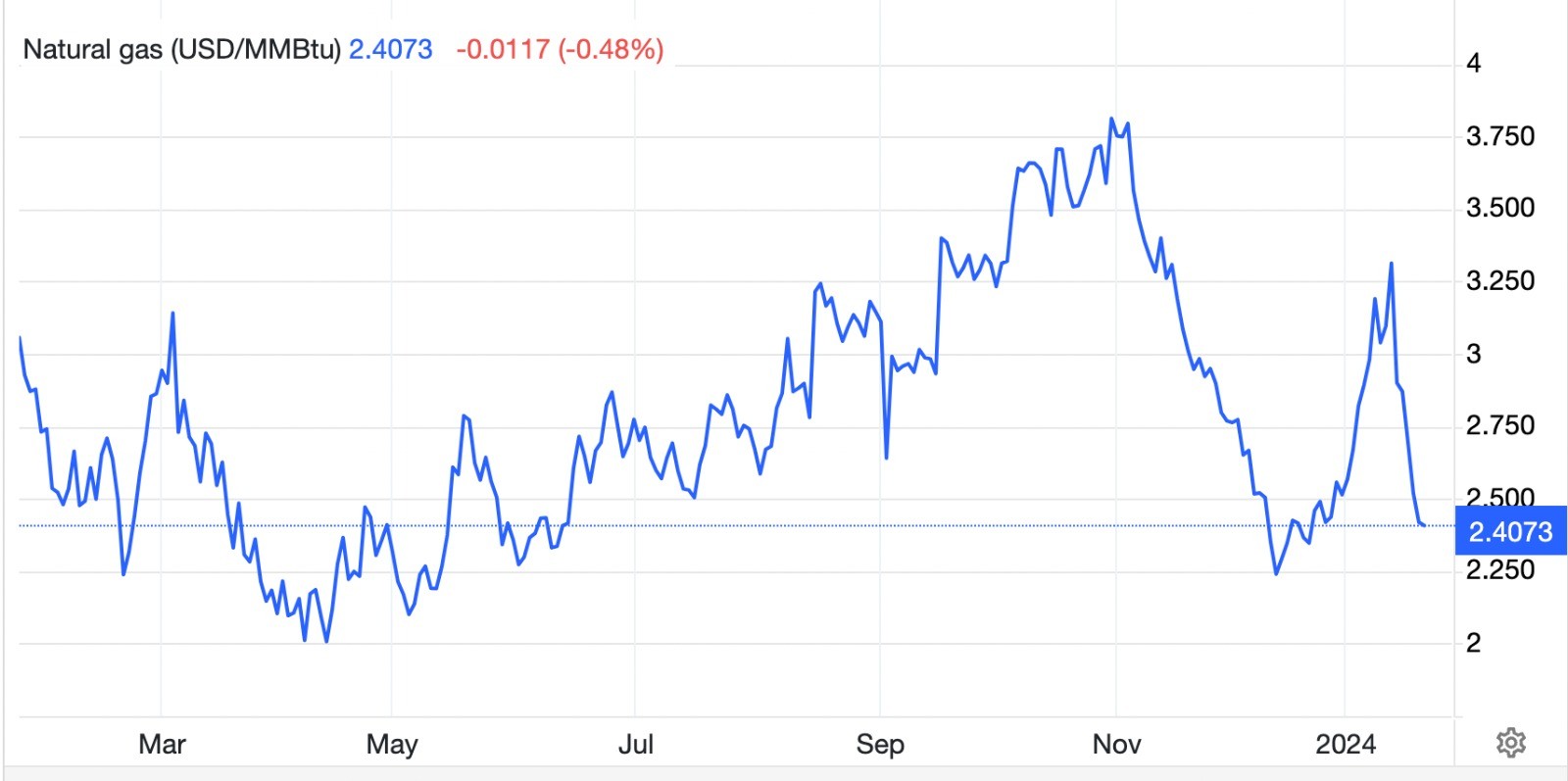 Harga gas alam sempat mencapai level terendah dalam sebulan setelah penurunan 24 persen pada minggu lalu, didorong oleh prediksi cuaca hangat untuk akhir Januari dan awal Februari 2024.