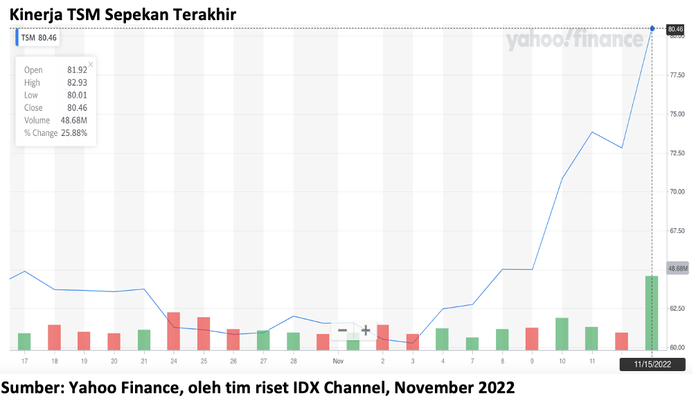 Berkshire mengakuisisi lebih dari 60 juta lembar saham perusahaan semikonduktor tersebut senilai hampir USD4,4 miliar berdasarkan harga penutupan hari Senin (14/11). Saham TSM pada bursa Taiwan melonjak 7,9% dan naik 12,6% di bursa AS. (Lihat grafik di bawah ini)