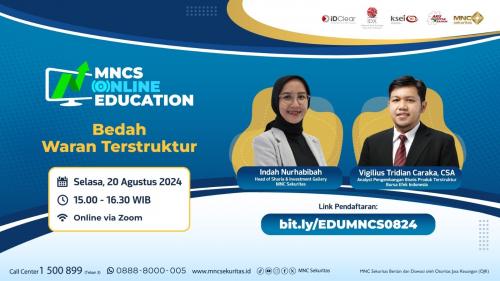Saksikan pembahasan lengkapnya dalam webinar gratis Bedah Waran Terstruktur, pada Selasa (20/8/2024) pukul 15.00 WIB sampai 16.30 WIB bersama Analyst Pengembangan Bisnis Produk Terstruktur BEI, Vigilius Tridian Caraka, CSA dipandu oleh Head of Sharia & Investment Gallery MNC Sekuritas Indah Nurhabibah. Daftar sekarang juga melalui bit.ly/EDUMNCS0824