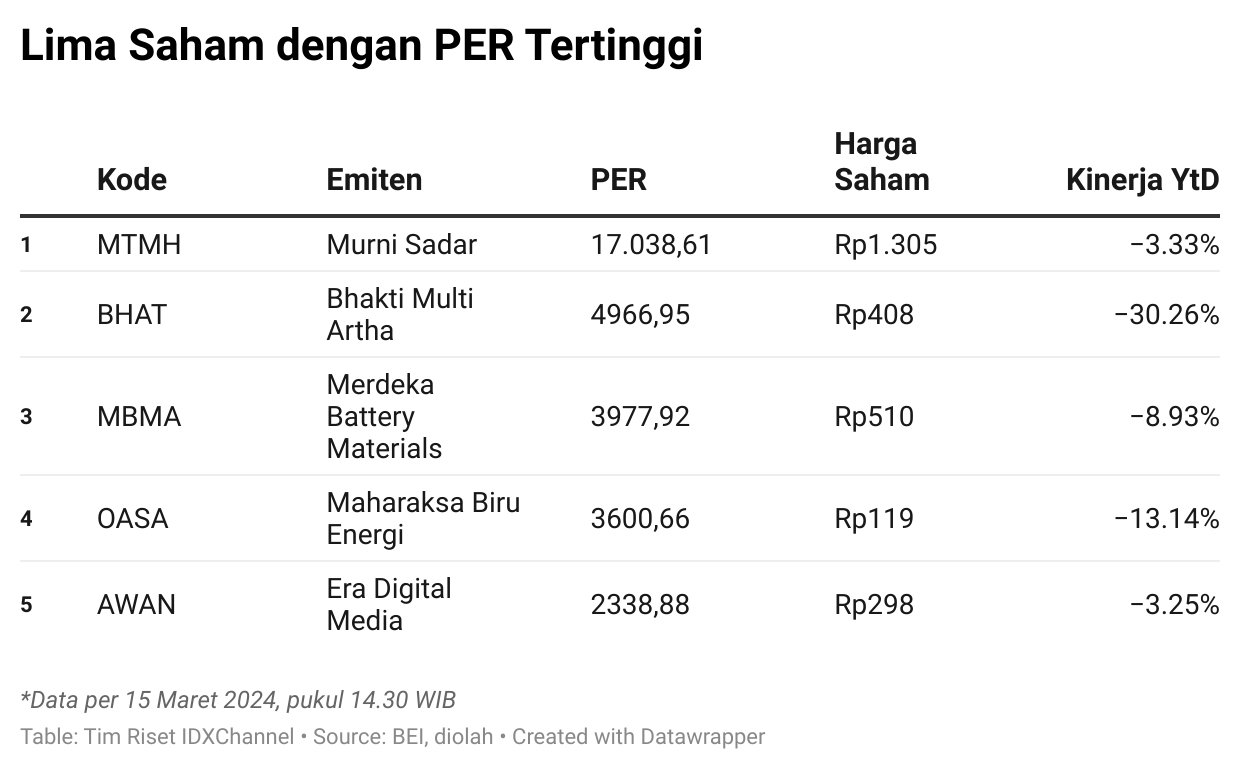 Demikian pula, emiten nikel PT Merdeka Battery Materials Tbk (MBMA) yang memiliki PER 3.977 kali. (Lihat tabel di bawah ini.)