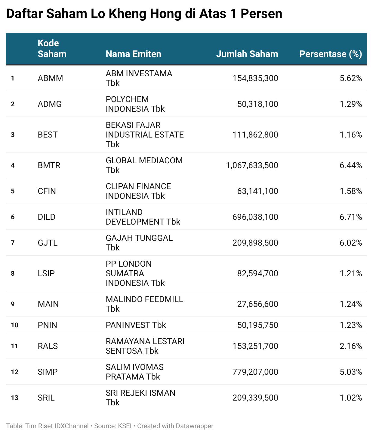 Ia juga tercatat memiliki 1,29 persen saham PT Polychem Indonesia Tbk (ADMG) sebanyak 50,31 juta saham, 1,24 persen saham PT Malindo Feedmill Tbk (MAIN) sekitar 27,65 juta saham, serta 1,23 persen saham PT Paninvest Tbk (PNIN) sebanyak 50,19 juta saham.