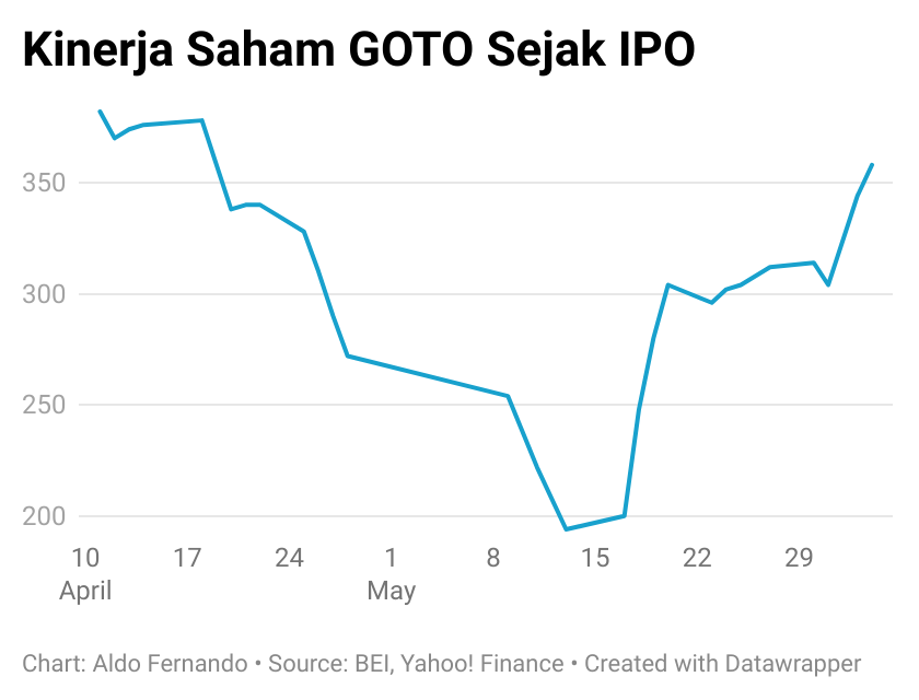 Saham GOTO memang sedang menemukan momentum pembalikan arah sejak paruh kedua Mei setelah sempat di harga Rp194/saham pada 13 Mei lalu. Sehubungan dengan tren itu, kemarin, harga saham GOTO melesat 13,16% ke Rp344/saham sekaligus kembali ke atas harga IPO (Rp338/saham).