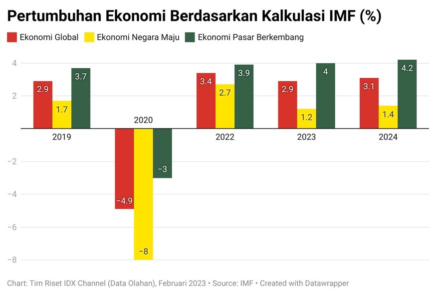Sementara IMF melakukan pembaruan Outlook Ekonomi Dunia Januari 2023 memproyeksikan bahwa pertumbuhan global akan turun menjadi 2,9 persen pada tahun 2023 tetapi naik menjadi 3,1 persen pada tahun 2024. (Lihat grafik di bawah ini)