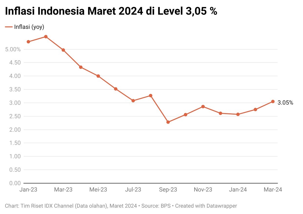 The Fed masih menjadi acuan bagi BI dalam menentukan kebijakan suku bunga nya. Padahal, jika dilihat dari tren inflasi, Indonesia sudah cukup sesuai dengan target bank sentral, meskipun ada kenaikan pada Maret 2024. (Lihat grafik di bawah ini.)