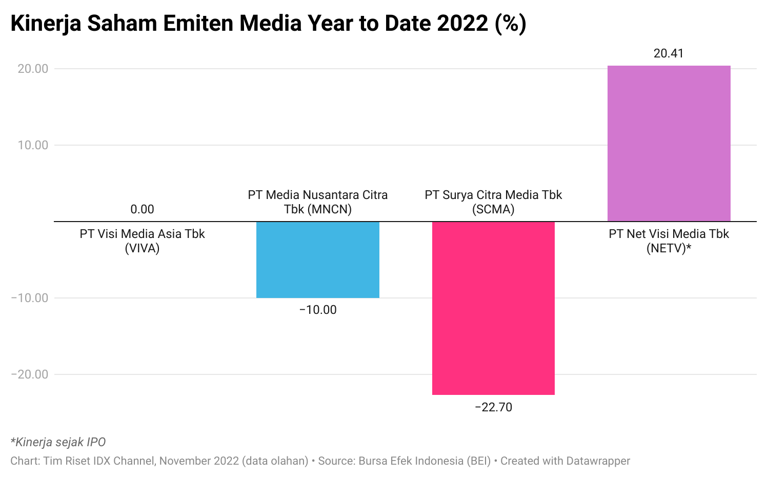 Menurut data BEI pada Kamis (24/11), saham NETV tumbuh 20,41 persen sejak pertama melantai di bursa pada Januari 2022 lalu. (Lihat grafik di bawah ini.)
