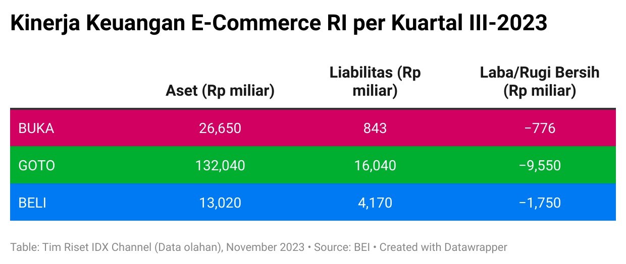 Meski demikian, laporan keuangan tiga emiten e-commerce RI memasuki kuartal tiga tahun ini masih mengecewakan. GOTO masih mencatatkan rugi bersih mencapai Rp9,55 triliun, sementara BUKA mencatatkan rugi mencapai Rp776,22 miliar dan BELI mencatatkan rugi Rp1,75 triliun. (Lihat grafik di bawah ini.)