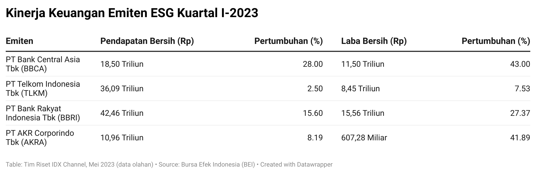 Sementara, dilihat dari kinerja keuangannya, sejumlah emiten ESG di atas membukukan kinerja yang moncer di kuartal I-2023.