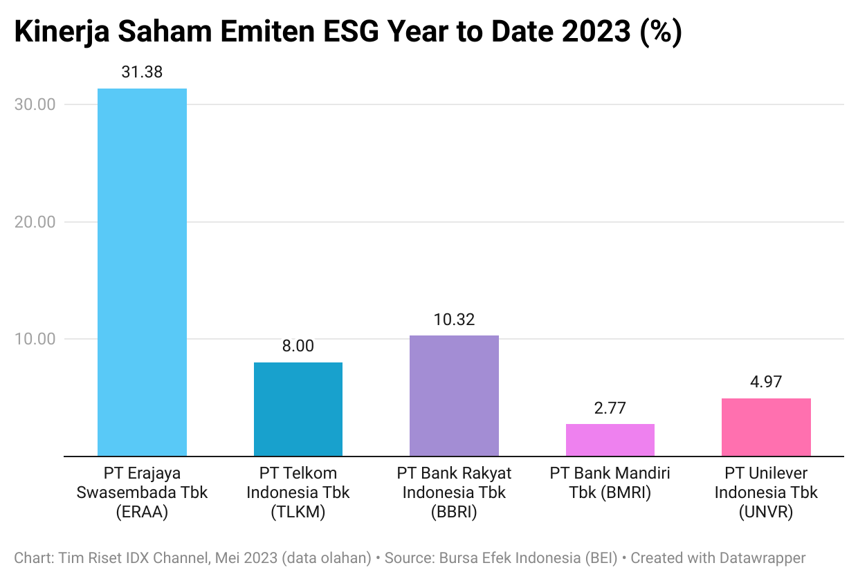 Dari kinerja sahamnya, ERAA mencatatkan performa yang paling moncer di antara saham-saham ESG yang disebutkan di atas. (Lihat grafik di bawah ini.)