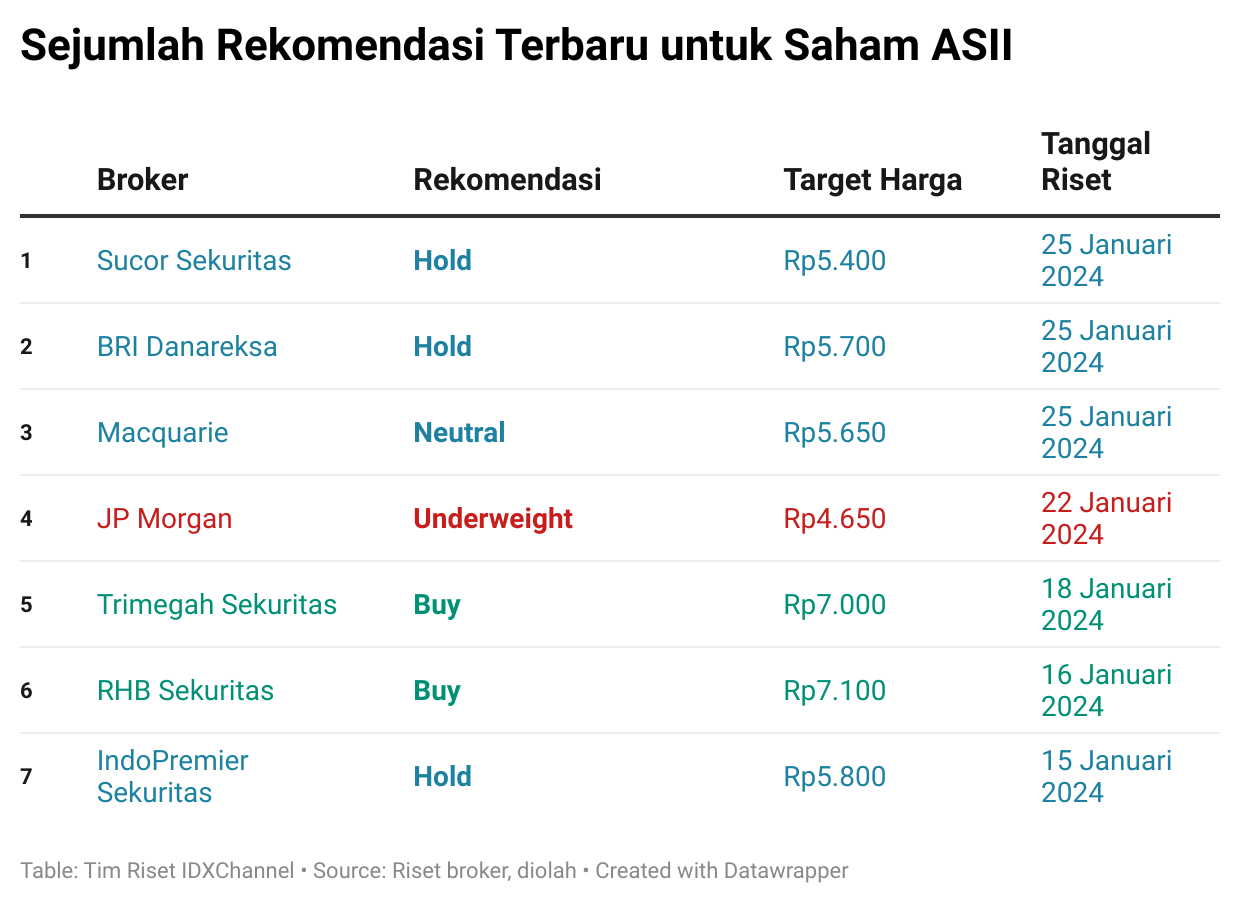 Sementara, Macquarie memberikan rating neutral dengan target harga Rp5.650 untuk saham Astra usai menggelar investor call dengan Head of Investor Relations Astra Tira Ardianti dalam rilis terbaru pada 25 Januari lalu.