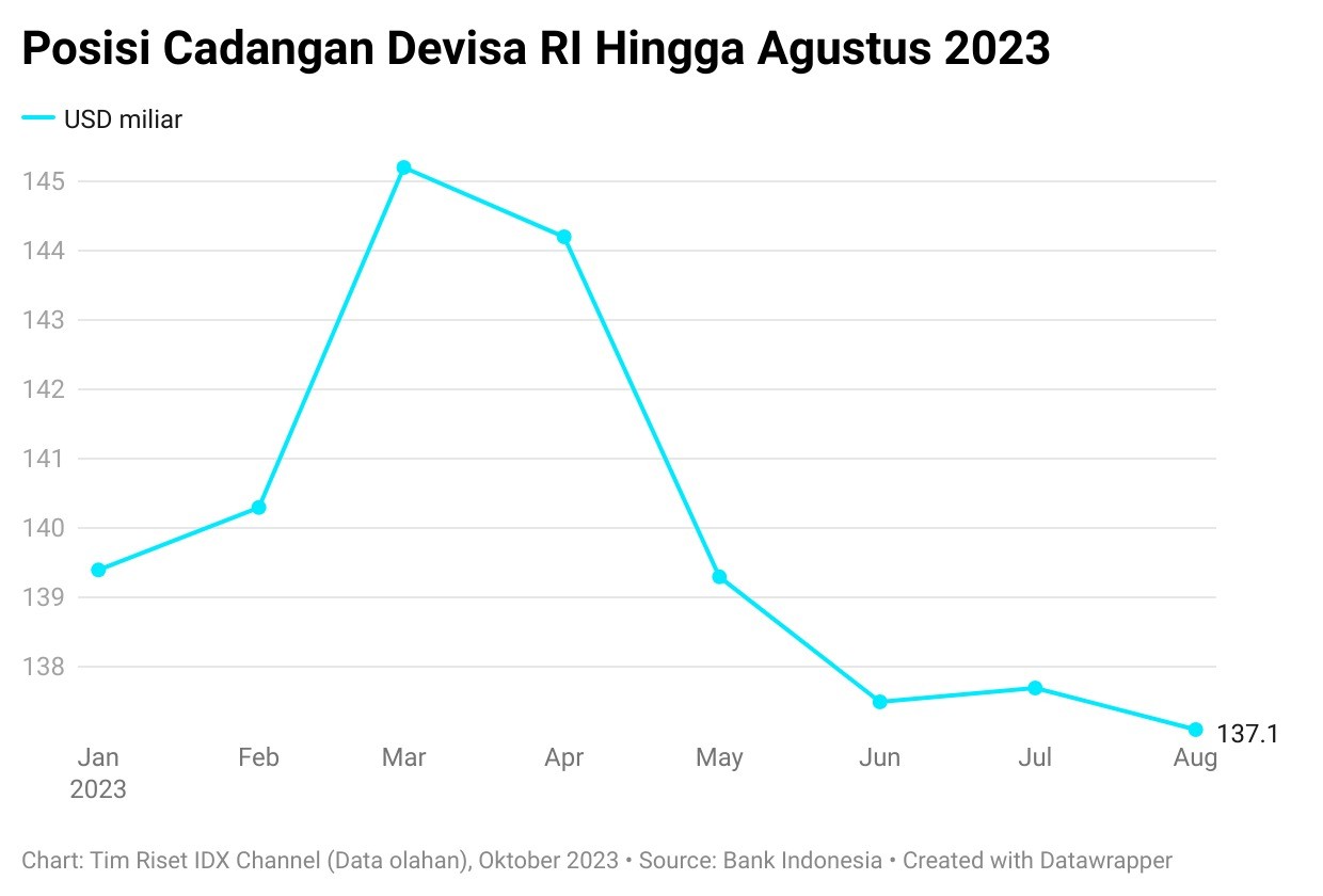 Sayangnya, posisi cadangan devisa Indonesia pada akhir Agustus 2023 turun di level USD137,1 miliar. (Lihat grafik di bawah ini.)