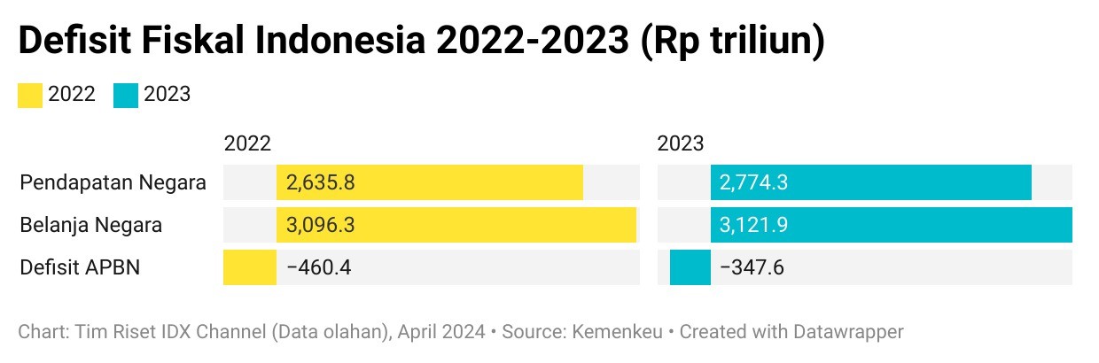 Di sisi fiskal, Anggaran Pendapatan dan Belanja Negara (APBN) masih terus mengalami defisit. Pada 2023, angkanya mencapai Rp347,6 triliun, melandai dari tahun sebelumnya sebesar Rp460,4 triliun. (Lihat grafik di bawah ini.)