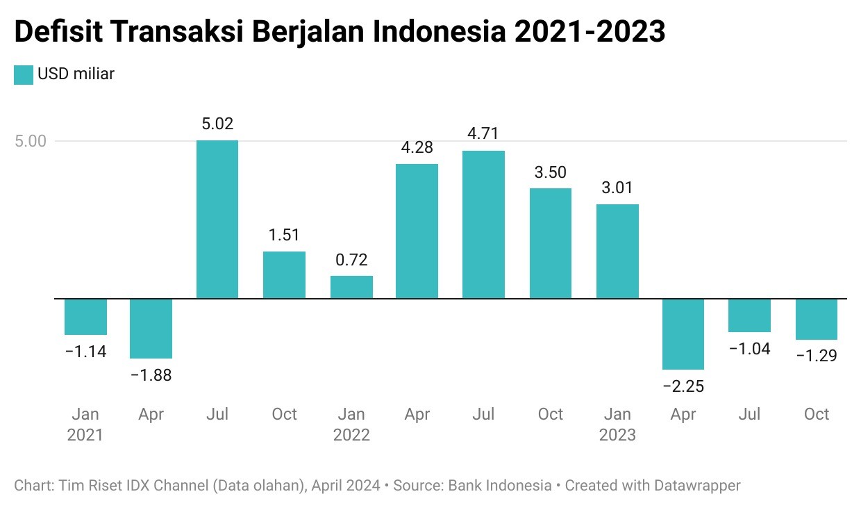 Sementara itu, pada akhir kuartal IV-2023 terjadi defisit USD1,3 miliar (0,4 persen dari PDB). (Lihat grafik di bawah ini.)
